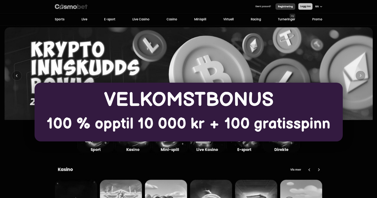 Cosmobet Casino inviterer deg til en spennende verden av online underholdning skreddersydd for norske spillere. Start reisen din med en generøs velkomstbonus på 100% opptil 5000 NOK, som gir deg ekstra midler å utforske et bredt utvalg av spill. Med moderate omsetningskrav på 35x sikrer vi en rettferdig og tilgjengelig opplevelse. Lisensiert av Malta Gaming Authority, tilbyr vi trygg og regulert spilling i Norge. Nyt fordelene som lynraske uttak innen 24 timer, dedikert 24/7 kundestøtte på norsk og en sømløs mobilversjon som lar deg spille hvor som helst. Vårt bibliotek inkluderer tusenvis av spilleautomater, live casino og klassiske bordspill fra ledende leverandører som NetEnt, Pragmatic Play og Evolution. Som et av de beste online casino i Norge, støtter vi enkle innskudd via Visa, Mastercard, Skrill og BankID, mens uttak er raske og sikre med rask utbetaling casino-standarder. Få en mobil casino bonus ved å spille på farten, og opplev ekte spenning uten kompromisser. Bli med i dag og oppdag hvorfor Cosmobet Casino er det ultimate valget for norske entusiaster.